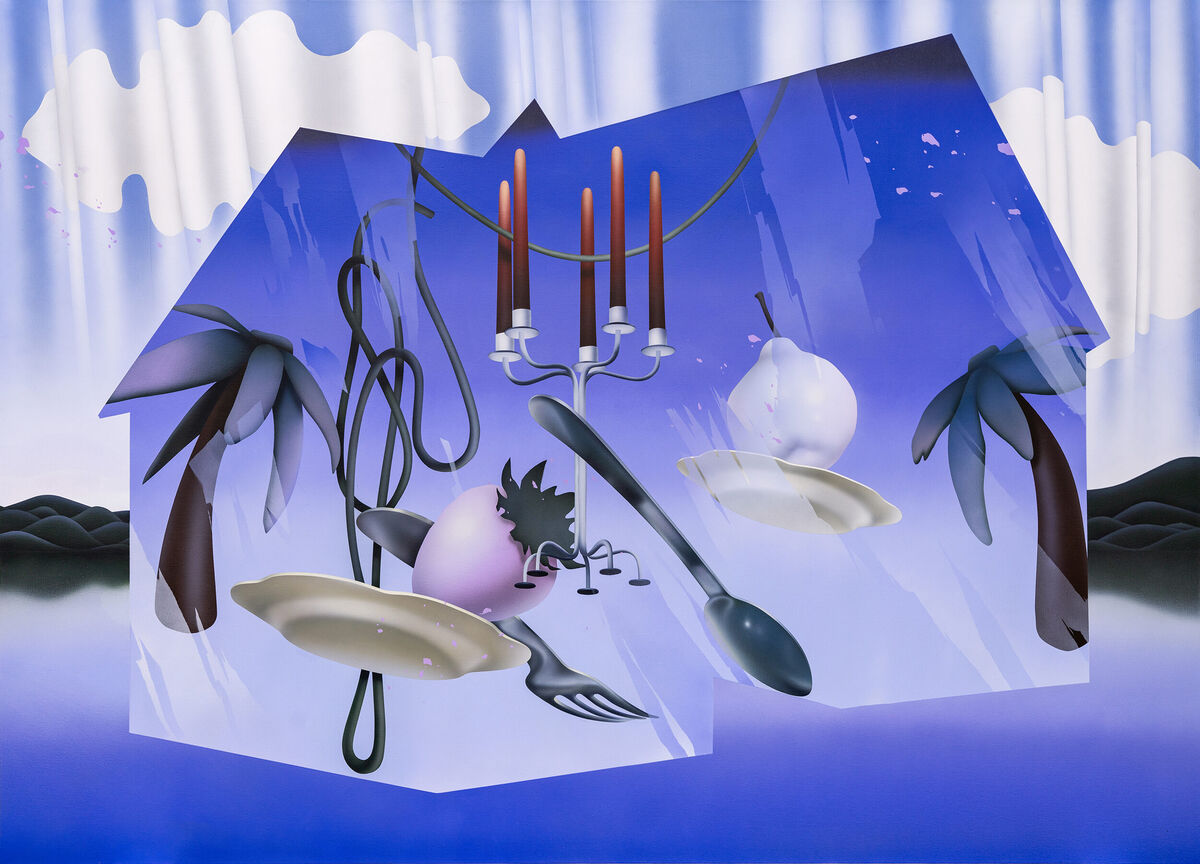 Hou’s manipulation of imagery reflects upon this phenomenon; combining digitally saturated compositions with the dimensionality of layered acrylics, the artist inflates certain objects while flattening others, crafting overtones of artificiality evocative of contemporary visual experiences.