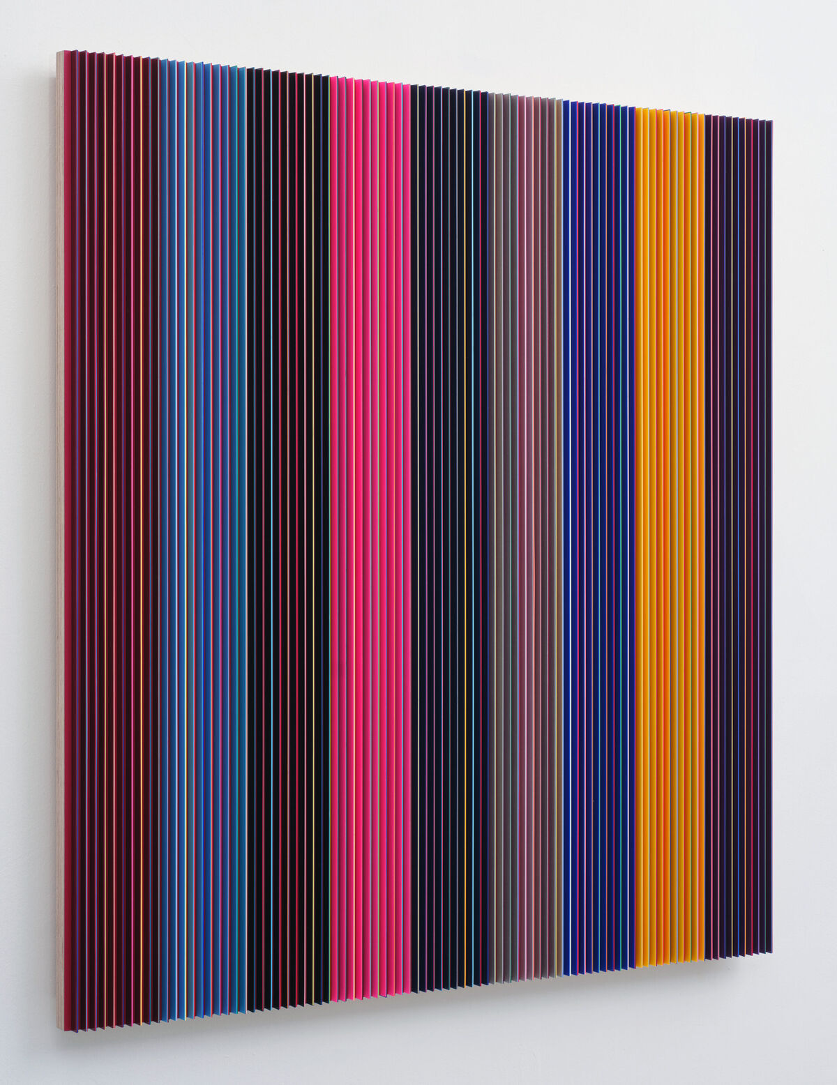 In den neuen Werkreihen »JUKEBOX« und »TARGET« von Jürgen Paas sind die installierten Wand- und Bodenobjekte auf die elementare Formensprache von Linie, Kreis und Quadrat reduziert. Einerseits zusammengesetzt aus spiralförmig aufgewickelten Farbbändern, andererseits in senkrechten Streifen addiert, enthüllen sie uns erst im Umschreiten oder im Vorbeigehen ihr vielfältiges Seherlebnis. Unterschiedlich gereihte Farbstreifen lassen den Betrachter im Vergleich der Einzelobjekte untereinander Erkenntnisse gewinnen, die von der Auswahl der Farben und deren Interaktion zueinander ausgehen.