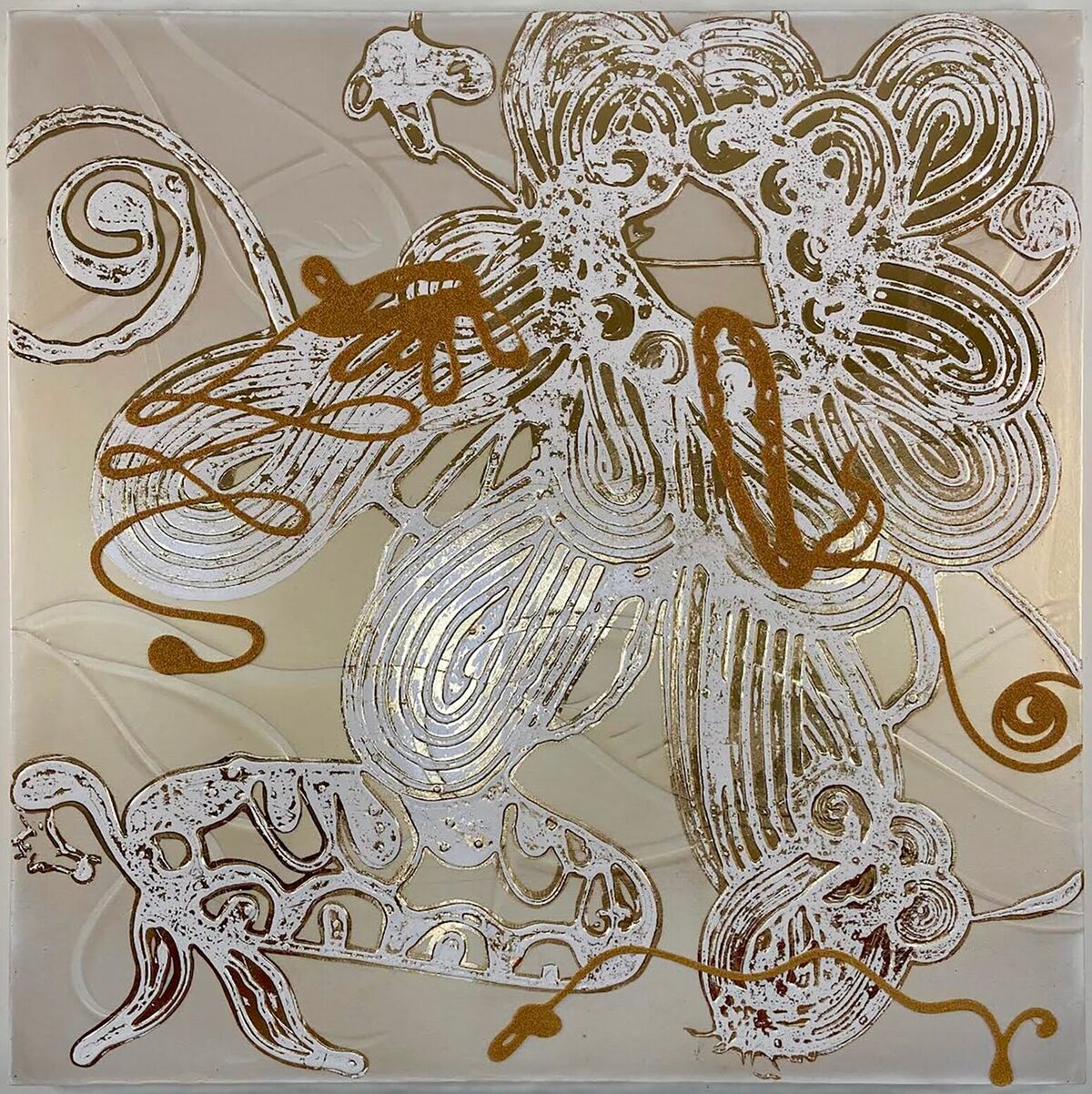 Imagined forms dance across iridescent surfaces, void of any vases, tables, or other natural elements that would ground them in the scale of a landscape or still life. Stripped of its natural colors, the organic imagery is imbued instead with neutral tones, metallic leaf, reflective mineral pigments and glass beads that change constantly depending on the space and position of the viewer.